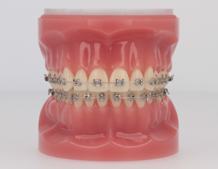 Eine feste Zahnspange besteht aus zwei Komponenten: kleinen Brackets, die auf die Zähne geklebt werden, und feinen Bögen, die diese Brackets miteinander verbinden.